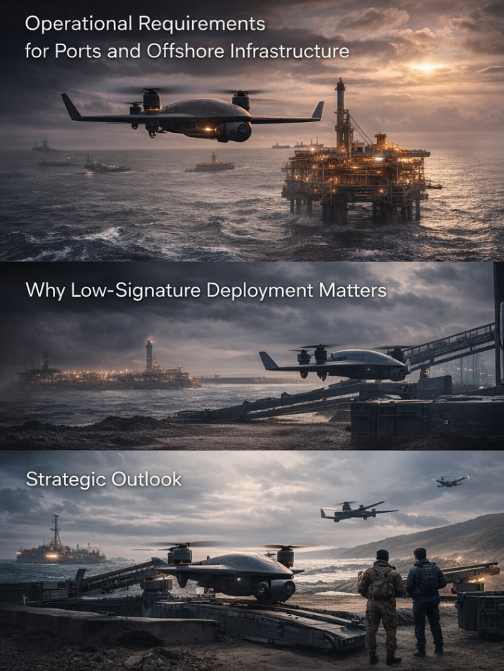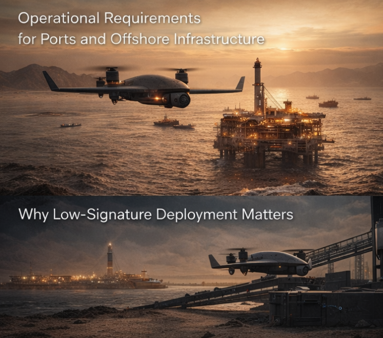 A credible monitoring architecture for port and offshore environments must do more than remain airborne. It must generate useful ISR output under realistic mission constraints. That means endurance, sensor quality, low-signature deployment logic, resilient communications, reliable launch and recovery cycles, and the ability to integrate into broader command-and-control or site-security workflows. The surveillance requirement also changes by environment. A container port may prioritise berth monitoring, perimeter awareness, vessel sequencing, and critical choke-point observation. An offshore platform or energy installation may prioritise exclusion-zone monitoring, approach detection, over-water perimeter coverage, and rapid visual verification of suspicious activity. A coastal terminal may require a blend of shoreline observation, harbour traffic awareness, logistics security, and after-hours monitoring. The common requirement across all of these is not a generic drone. It is a mission-adaptable system that can support persistent awareness as part of a larger operational architecture.