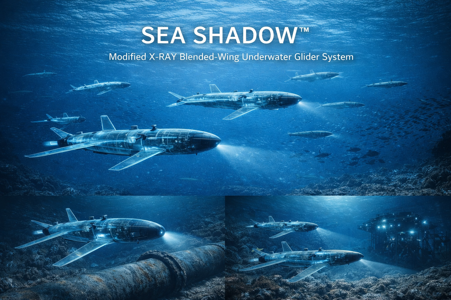 All systems in this family are based on the Sea Shadow architecture, a modified blended-wing underwater glider concept developed for persistent below-sea performance. Sea Shadow combines efficient subsea glide mechanics, intelligent autonomy, and modular sensor capability in a platform intended for long-range deployment, reduced support burden, and low-noise maritime operations.